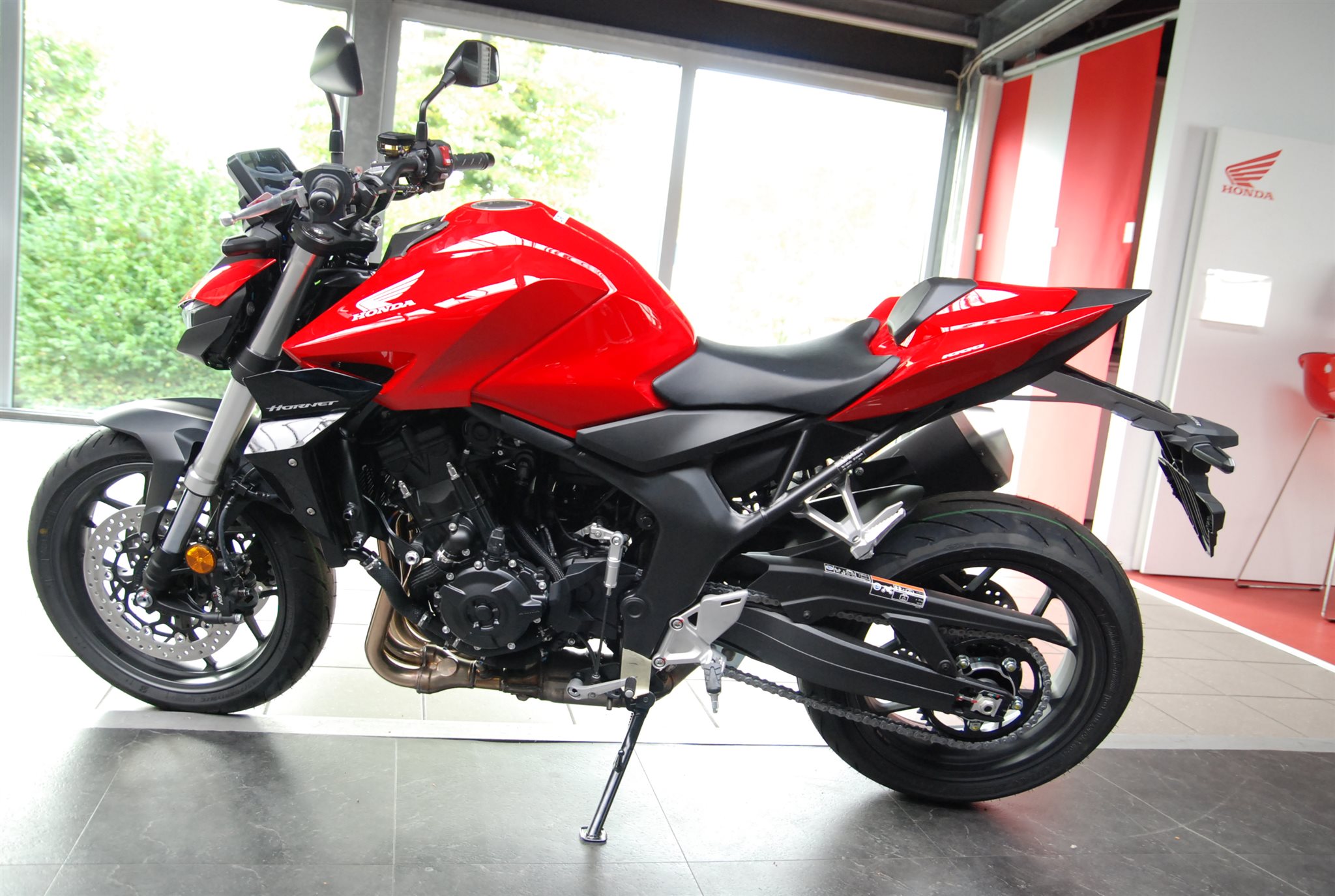 Es hat einen unglaublichen Motor. Und das Äußere einer waschechten Streetfighter-Maschine. Die CB1000 Hornet bietet jedoch auch ein einzigartiges Handling. Vom Großstadtdschungel zur kurvenreichen Landstraße. Der einteilige Stahl-Brückenrahmen verlagert aufgrund seiner Geometrie das Gewicht nach vorn auf das Vorderrad und erhöht die Torsionssteifigkeit um 70 %, was für einen agilen Kurveneingang und ein dynamisches Lenkverhalten sorgt. Außerdem ist ein Showa-Federbein montiert, das über Pro-Link für perfekte Federungskontrolle sorgt. Dazu kommt die Lenkpräzision der einstellbaren SHOWA SFF-BP Upside-Down-Gabel mit 41 mm Durchmesser. Die radial montierten Vielkolbenbremszangen von Nissin an der Vorderradbremse mit 310 mm großen, schwimmend gelagerten Bremsscheiben sorgen für eine starke Bremsleistung. Dank des breiten Lenkers und der Fahrposition verschmilzt du mit dem Motorrad.